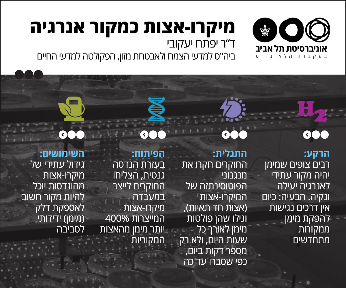 גם בעידן שלנו מנסים חוקרים בכל רחבי העולם למצוא את "הנס" הבא – מקורות אנרגיה חסכניים שיוכלו לשרת את האנושות, לחסוך בפליטת גזים רעילים ולשפר את התעשייה ואת הכלכלה. אחד מהחוקרים הללו הוא ד"ר יפתח יעקובי, ראש המעבדה לאנרגיה מתחדשת בביה"ס למדעי הצמח ואבטחת מזון, בפקולטה למדעי החיים ע"ש ג'ורג' ס. וייז באוניברסיטת תל אביב. ד"ר יעקובי וצוות המחקר שלו מצאו דרך יעילה לייצר אנרגיה: להגביר את תפוקת המימן שפולטות אצות חד-תאיות. לא סתם להגביר, אלא להכפיל פי חמש.