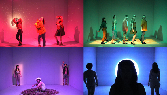 ארבע תמונות תאורה שונות באותו חלל, המייצרות איכויות שונות לחלוטין של אווירה, מיקום ונקודות מבט. (צילום: מתוך הפקת TAU "אמסטרדם", מאת מאיה סער יסעור, עיצוב תאורה נגה שביט)
