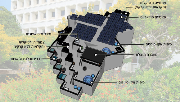 כך ייראה הגג. צמחייה ורטיקלית, פאנלים סולאריים, כיפות אקו-סיסטם, מעבדה מוצלת, מיכל מים אפורים ובריכות לגידול אצות