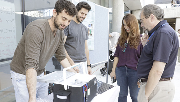 משמאל: נתנאל, עמית, פרופ' הדס ממן ופרופ' אורח מחו"ל בתערוכת הפרויקטים השנתית של בית הספר להנדסה מכנית
